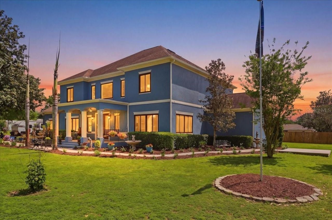 This luxury estate in North Lakeland, Central Florida sits on 1.95 acres on a quiet, private drive with only seven homes. The property is zoned for horses and approved for a home-based business. The home welcomes you with 8-foot French doors opening to a grand foyer and soaring 25-foot ceilings in the main living area. Enormous windows flood the open floor plan with natural light. Architectural details include arches, columns, and a stone half wall separating the foyer from the living area. The living room features vaulted and cathedral ceilings, double doors to the backyard, and a gas fireplace with a stylish two-tone gray brick/tile surround that perfectly complements the gray tile floors. The remodeled kitchen features quartz countertops, solid wood cabinetry including glass-front cabinets, and a tiled backsplash that matches the fireplace, creating a cohesive design. Additional highlights include a dry bar with built-ins and microwave, and a kitchen island with a sink and extra cabinetry. The stainless steel appliances include a double oven, dishwasher, and large refrigerator. An attached eating area with a chandelier, large windows, and sliding doors to the backyard creates a bright, airy space. The first floor also offers a formal dining room, a convenient half bath, and an office/den with abundant windows and a closet that could also serve as an extra bedroom. In addition, there is a separate laundry room with ample cabinetry, countertops, and a utility sink, with a door leading to the garage, and a dual laundry chute connecting the upstairs bedrooms directly to the laundry room. The primary suite on the first floor boasts a walk-in closet and an ensuite bathroom with dual sinks, garden tub, separate walk-in shower, and built-in shelving. Upstairs, a spiral staircase leads to a balcony overlooking the main living space. Additional bedrooms are connected by a Jack and Jill bathroom with enormous walk-in closet, and there is a huge bonus room. Ceiling fans are installed throughout the home, and window treatments along with hurricane/impact-resistant Andersen windows provide both elegance and protection. Outdoor living is enhanced by two covered porches, a side patio, a partially fenced backyard, a 50-amp RV hook-up, a utility shed with electricity, an oversized garage, an irrigation system, professionally landscaped grounds, and a new well installed in 2025. Additional features include electronic blinds, Ring security cameras, a newer roof (2021), three A/C units (2022), upgraded attic insulation (2023), and a 74-gallon propane water heater. Ideally located minutes from Publix, shopping, and dining, and right off Kathleen Rd with easy access to I-4, Tampa, Orlando, and 570, this property offers the perfect blend of rural tranquility and city convenience. Please note the following items will not convey with the sale: fountains, garage rack system, mounted TVs, gray shed in the backyard (not attached), countertop microwave, front porch swing, and hanging plant baskets and staghorns. Additional note: Seller is willing to remove the dog pen in the front yard prior to closing if the buyer does not want it.