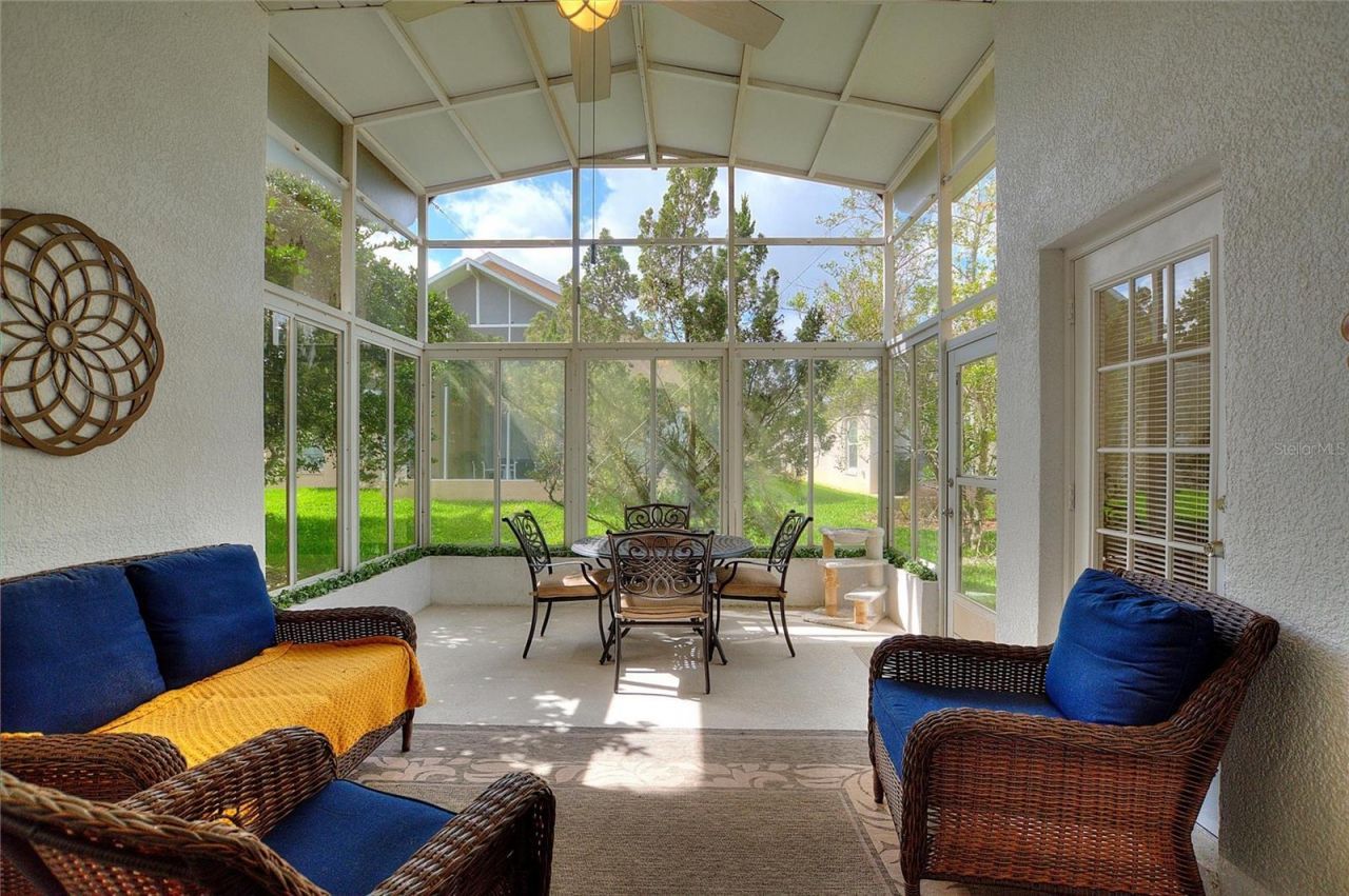 One or more photo(s) has been virtually staged. RidgeGlen 3/2 model with 2019 HVAC, 2019 water heater, recently-inspected 2018 roof and mostly-enclosed extended south-facing lanai, located in gated Davenport 55+ community just 0.1 miles from High Vista's private clubhouse and amenity center. Stamped concrete driveway and walkway to an under-roof front entry with domed overhead transom window opens to an expansive great room with laminate floor and a 9-13 FT vaulted ceiling. Adjacent combination family room / kitchen with solid wood cabinets, quartz countertops & breakfast bar, stainless steel appliances and sky tube. Primary en-suite bedroom with French-door to lanai has and full private bath with granite-topped double-sink vanity, soaking tub with separate shower, natural lighting through the glass-block window, linen & walk-in closets. Split bedroom design offers a cozy guest area with full bath and 2 guest rooms, each with their own hallway linen closet. Corridor access laundry room has washer, dryer and a utility sink with an overhead cabinet. Garage has Genie Pro opener and pull-down ladder access to attic. Sold As-Is. Ridgewood Lakes is a golf cart friendly community. $230 monthly High Vista HOA fee includes Spectrum internet and basic cable TV with 2 cable boxes, lawn mowing and exclusive access to resident-owned 12,000 SF private High Vista clubhouse and amenities. $425 semi-annual Ridgewood Lakes HOA fee provides 24x7 staffed security gate and master association-owned private road maintenance. Adjacent to 18-hole White Heron Golf Club with The Nest restaurant, privately owned and open to the public. High Vista is a 55+ community with outdoor heated pool and spa, fitness center, library, pub & many organized activities. Pickle ball, tennis, bocce and shuffleboard courts. Miles of biking and walking trails within Ridgewood Lakes gated community. Shopping, Disney, Universal, Orlando & Central FL entertainment nearby, easy access to I-4, medical facilities, airports & Sunrail Station. Advent Health hospital is 3 miles away.